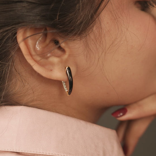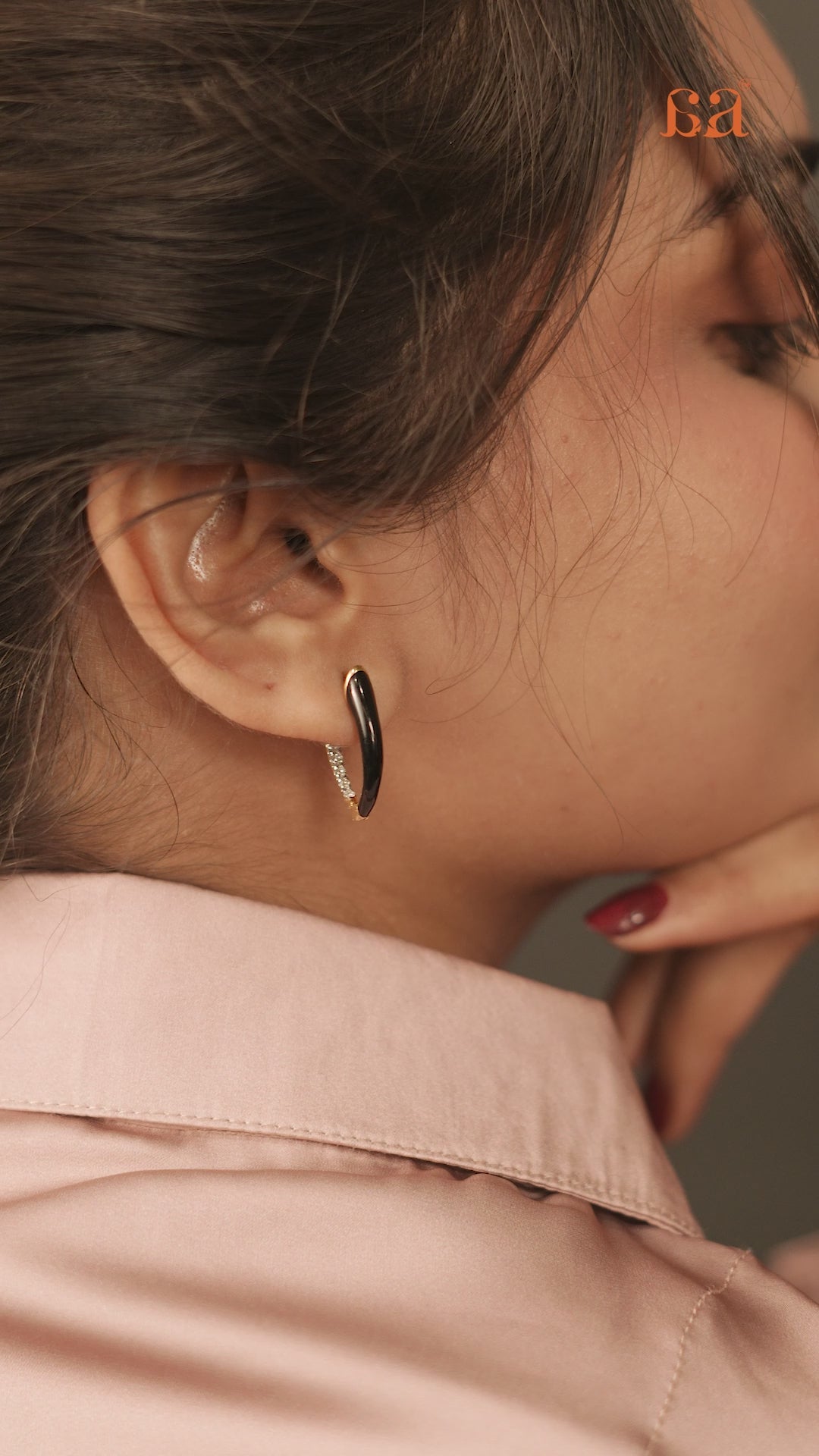 Classic Black Diamond Hoops is crafted in 9KT Gold.This a classic look with combinations of Diamonds,Black enamel & Gold. Wear them with during the Day or Night..They sure will make a few heads turn.