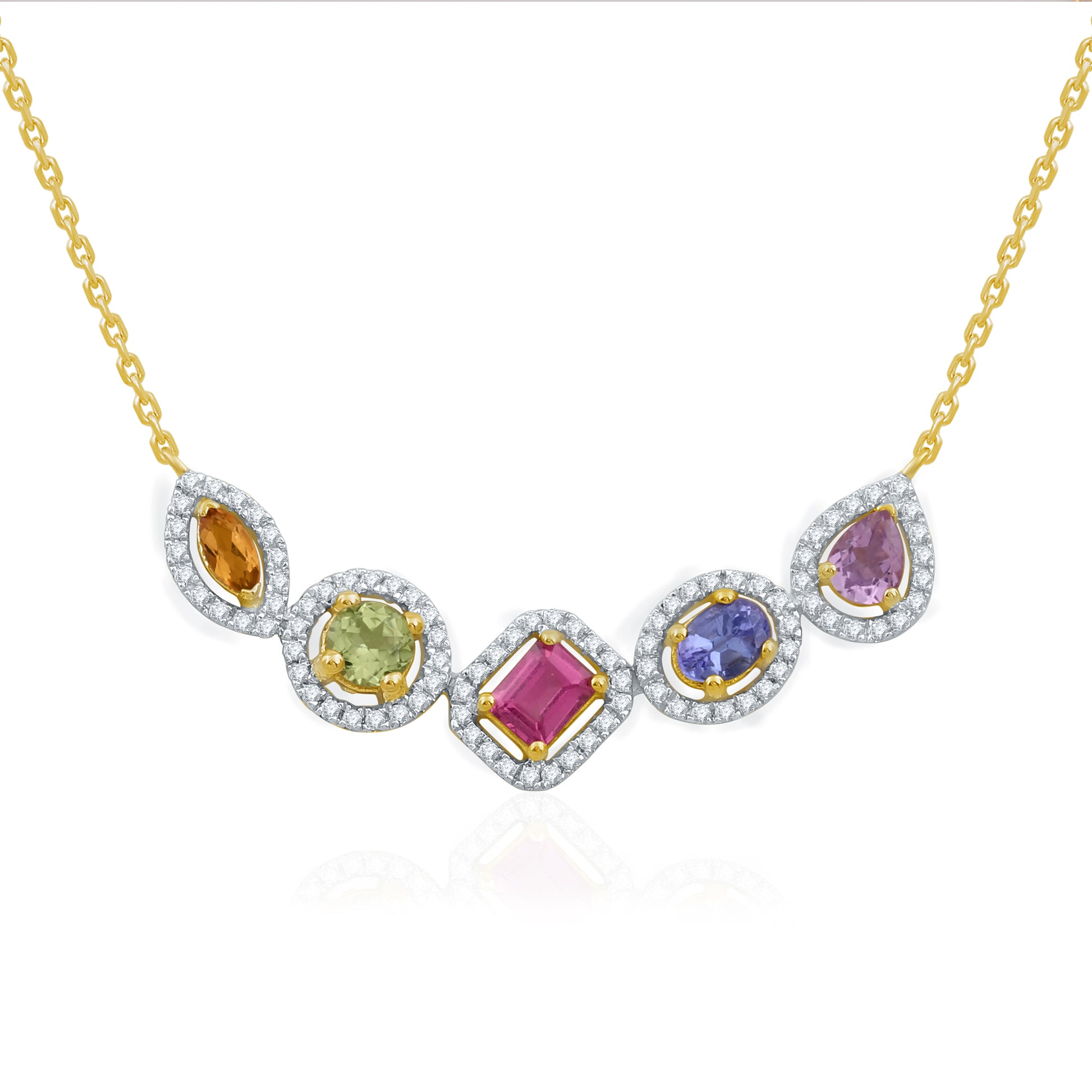Make a Statement with the Aurora Glow Earrings.Crafted in 9KT Gold,they showcase a striking lineup of Multi shaped,Vibrant gemstones like Peridot, Amethyst, Tanzanite & Rhodolite with Diamond halos.