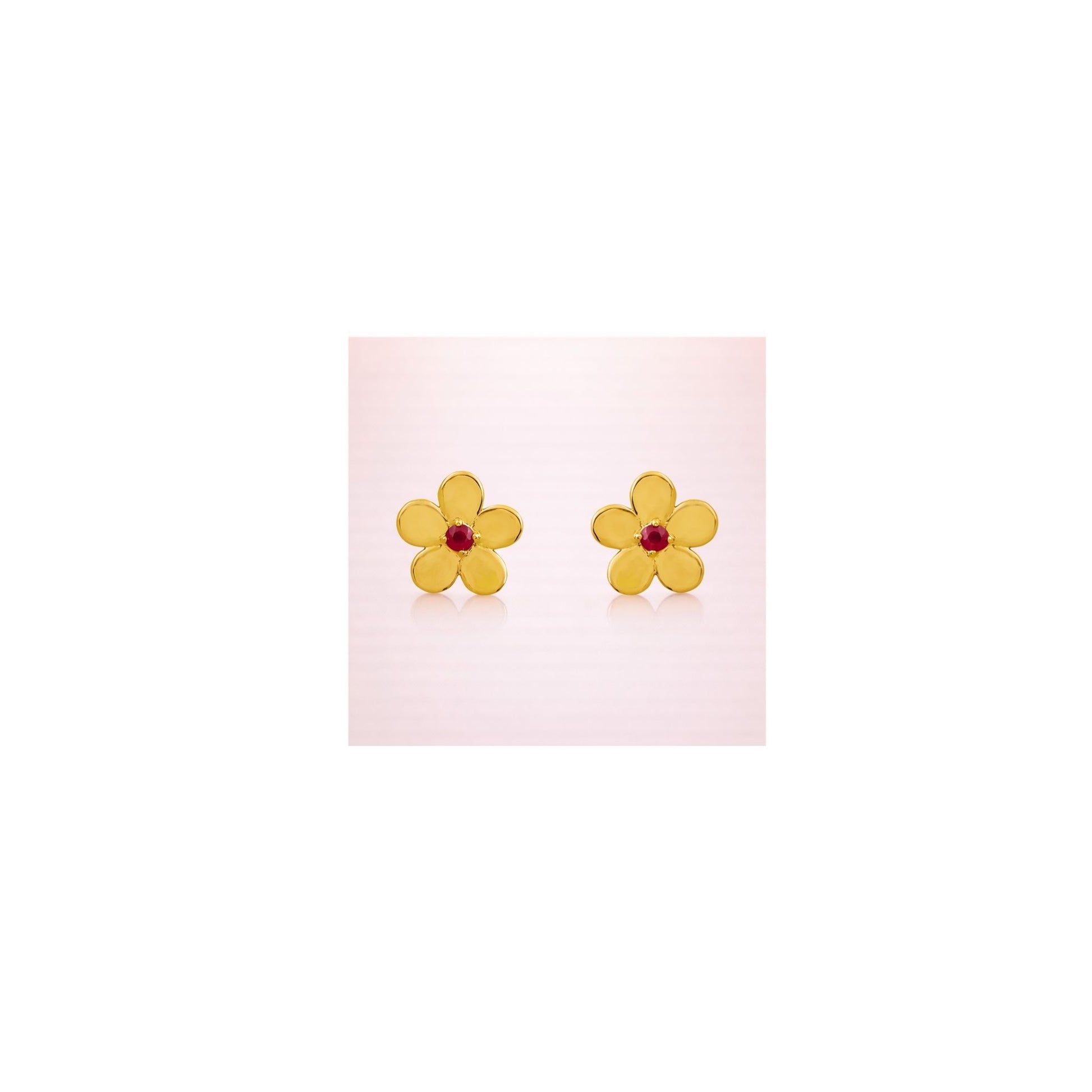Pink Flower Petals Pals Earrings are made in 9KT Gold featuring Ruby semi precious Gemstones in the middle. Customise these middle Gemstones with Ruby,Pearl,Emerald,Malachite,Diamond or Turquoise.