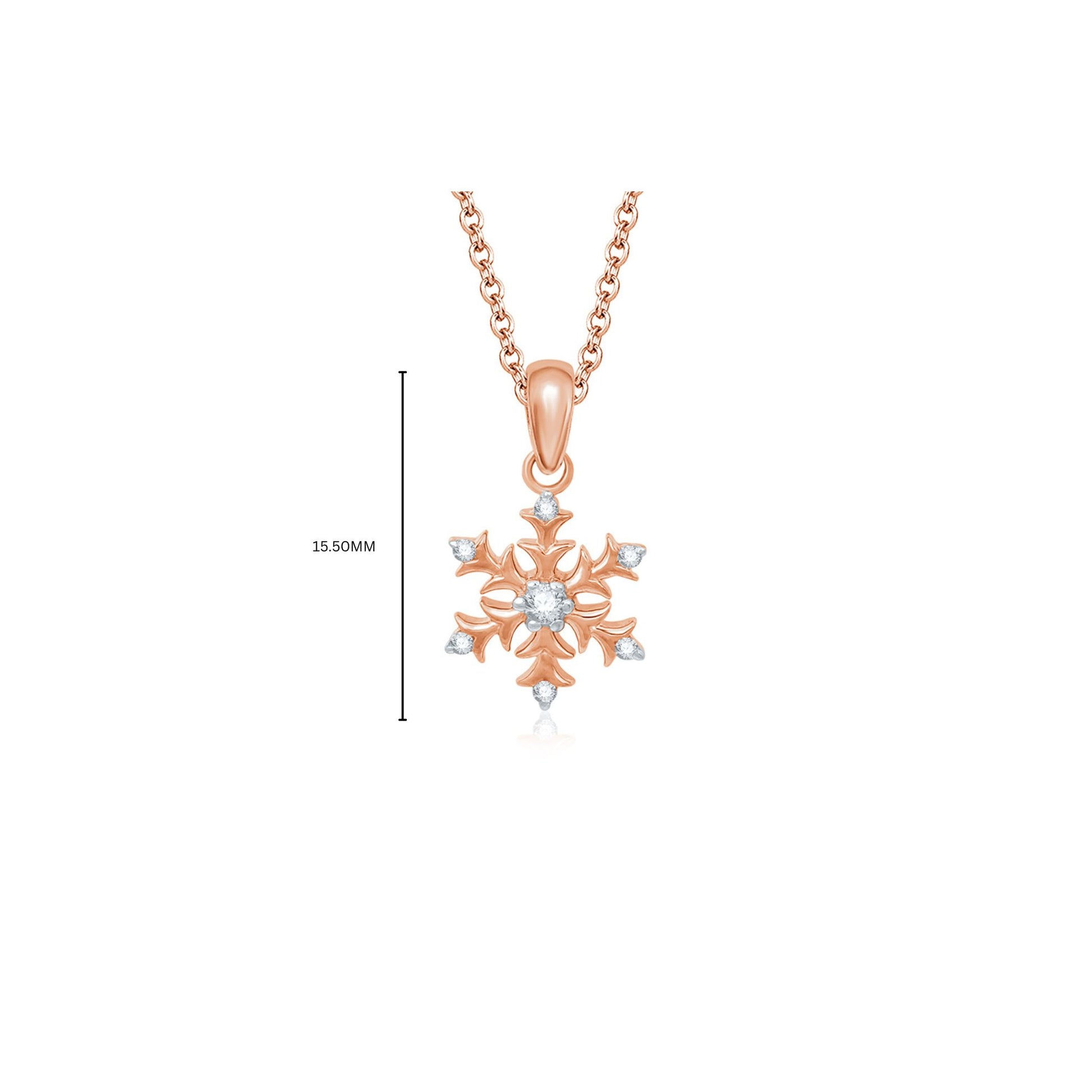 The Snowflake Rose Gold Diamond Pendant features seven dazzling diamond pieces set in 9KT Gold.This pendant exudes timeless elegance and sophistication, capturing the essence of dazzling brilliance and understated luxury. Perfect for adding glamour to any neckline.
